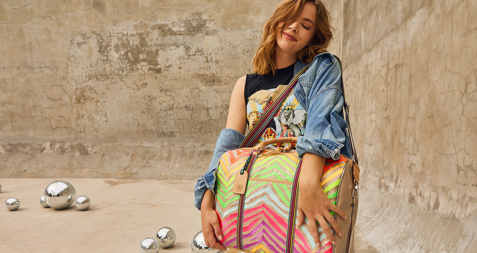 - Natural leather handles and multicolored, woven, adjustable cross-body shoulder strap